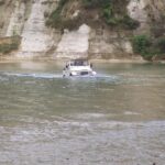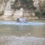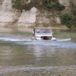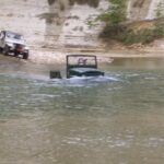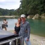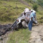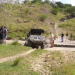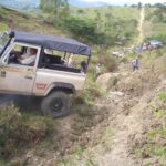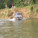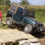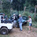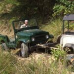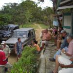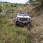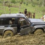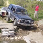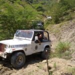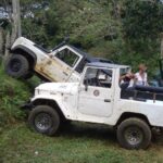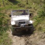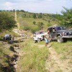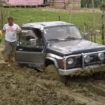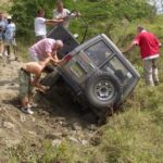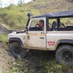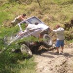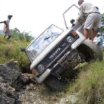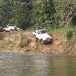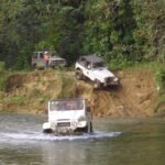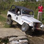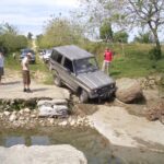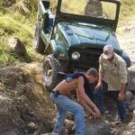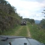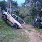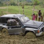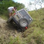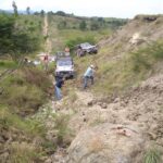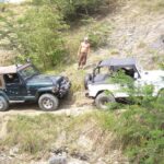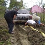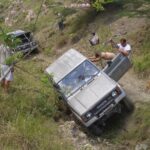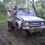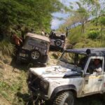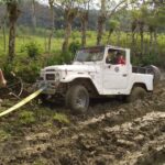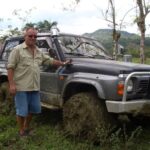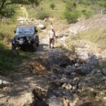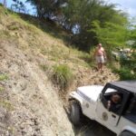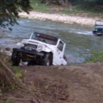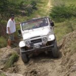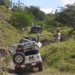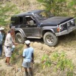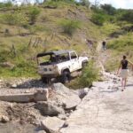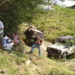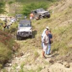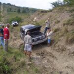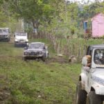 Sorry only in spanish. Esta no fue una excursión para todos los vehículos de nuestro club, ya que nos hemos dado cuenta tour tras tour que algunos de nuestros vehículos no tienen gomas para mud terreno, diferencial de bloqueo o winch necesitan con frecuencia la ayuda de los que tienen estos detalles. Para mi el primer camino fue intransitable, pero el maestro Hubert con su cigarro mostró lo contrario, con pico, pala, winch y mucha fuerza humana logramos transitar un camino destruido. Herman con su Land Cruiser se cayo de lado y vimos una oportunidad de tomar fotos extraordinarias. Los vecinos confirmaron que desde hace 2 años nadie pasa por ese camino entre La Gran Parada y el Acueducto de Montellano. Después pasamos caminos de vacas con mucho lodo y la única salida para todos menos para el Defender 90 fue una finca que pasamos. Después cruzamos ríos los cuales eran mas profundos de lo que pensamos y algunos no llegaron con ropas secas al otro lado. En medio de la nada encontramos un colmado y nos detuvimos a tomarnos un par de tragos como el rico ron Dominicano BRUGAL con cola. salud y hasta pronto. jens