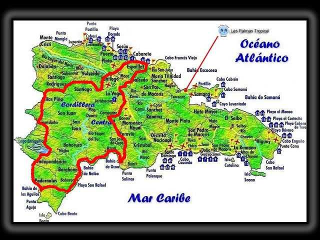 Route: Sosua- Constanza-San Jose de Ocoa-Azua-Barahona-Pedernales-Playa de las Aguilas-Jimani-Elias Pina-Loma de Cabrera-Carretera Internacional-Restauracion-Mao and back to Sosua. Aprox. 1200 km. Max. hight aprox. 2600 m ( 8450 ft ).