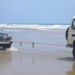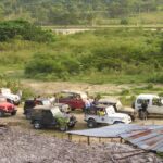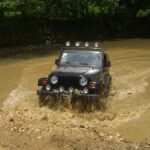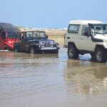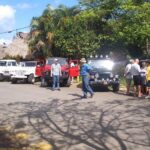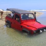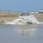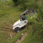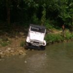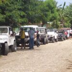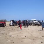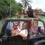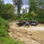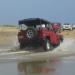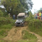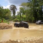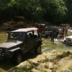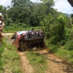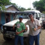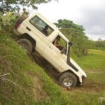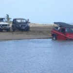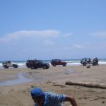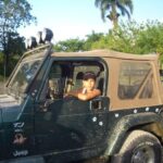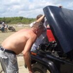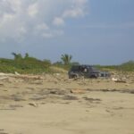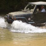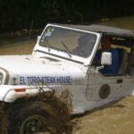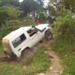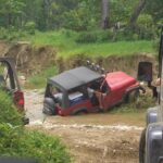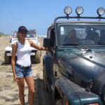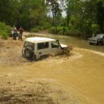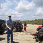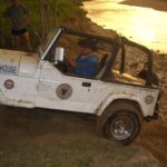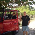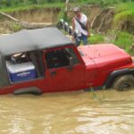 Der Stier (El Toro – das Restaurant von Klaus und Gisela – der Clubtreff) döst noch ungestört in der sonntäglichen Morgensonne, was sich aber gleich ändern wird. Die Offroad-Pirates kommen – elf Jeeps nehmen heute teil an einer Tour, die an Schwierigkeitsgrad alle bisherigen schlagen wird. Zwei Motorrad-Piloten werden außerdem dabei sein und sich als ´´reitende Boten´´ zwischen Vor- und Nachhut später mehrmals als sehr nützlich erweisen. Aber soweit sind wir noch nicht, sondern lassen es gemächlich angehen. Aufbruch um 10:00 a.m. nach dem obligatorischen Gruppenfoto, für das am Ende nach evtl. Kollateralschäden (wie es George W. Bush nennen würde) nicht mehr alle zur Verfügung stehen werden. Aber eins nach dem anderen! Der erste ´´Boxenstopp´´ findet dann auch schon nach wenigen Minuten statt: an der Coastal Tankstelle. Nein, alle haben natürlich vollgetankt, solche Beschwerden sind absurd. Aber einem Jeep fehlt Flüssigkeit – nicht in der Kühlbox an Bord, aber ….der Mechaniker, der zwecks Generalcheck Thomas´ Landrover Defender 90 gestern noch in der Mache hatte, vergaß doch tatsächlich, den Offroader mit Kupplungs- oder Bremsflüssigkeit – oder wie und was auch immer – entsprechend zu versorgen. Kopfschütteln ist die vorläufige Reaktion. Nicht lange aufhalten, sondern auffüllen und weiter geht´s – entlang der Küsten-Hauptstraße bis Sabaneta, dann eine Straße durchs Campo zum Meer. Robinson Crusoe Szenario: angeschwemmtes Treibholz bedeckt den kilometerlangen einsamen Sandstrand – unterbrochen durch bizzare Baumriesen, die der stürmische Atlantik dort stranden ließ. Ein Traum: wo kann man solche Strandfahrten sonst noch machen, ohne mit dem Gesetz in Konflikt zu geraten?! So fahren und genießen wir die problemlose Strecke Richtung Osten entlang am Wassersaum bis zur Flußmündung La Boca de Yasica. Flußdurchquerung: (fast) alle marschieren sauber durch. Thomas will es jedoch auf dem direkten Wege wissen und versenkt seine Schnauze (die seines Landrovers – wohlbemerkt !) wie ein durstiges Tier ins Wasser und ´´will´´ dann gar nicht mehr weg. Renato (Wrangler ) und Hubert (Toyota Landcruiser) müssen mit ihren beiden Winches ihn davon überzeugen, daß zuviel (ab)Saufen ungesund ist, und ziehen ihn durch den Fluß. Klaus´ Wrangler erreicht zwar problemlos das andere Ufer, aber dann streikt er: die Bugwelle hat ihm etwas zu reichlich Wasser in den Ventilator gespült. (Später – hinter Gaspar Hernandez ist er plötzlich wieder da, als wäre nichts gewesen.) Las Canas parallel am Meer entlang erreichen wir die Hauptstraße nach Gaspar Hernandez, biegen dann auf die 233 in Richtung Tenares, die wir aber auf halber Strecke verlassen in Richtung Joba arriba nach Westen. Zwischenstopp an einem Colmado. Mama Negra – die kugelrunde Wirtin – scheint uns schon zu erwarten, hat sie doch schon einige Male die Offroad-Pirates bewirtet. Weiter geht´s in die Berge, wo unwegsame Trampelpfade mit einander wetteifern: einer immer schwieriger und steiler als der andere – hinauf wie auch hinunter. Wir bewegen uns auf Ojo de Agua zu. Marcos Wrangler gibt zornig krächzende Töne von sich, die zu denken geben, obwohl der Motor gesund klingt. Zum Glück haben sich nur ein paar Holzstückchen verfangen. Um sie herauszulösen, muß allerdings eine Plastic-Schutzverkleidung mit einem Messer herausgeschnitten werden, nachdem man dem Motor etwas Zeit zum Abkühlen gegönnt hat. Viele Flußläufe werden durchquert –namenslose oder Arme vom Rio Jamao und vom Rio Yasica: jemand von der Teamleitung sagte etwas von 20 geplanten Durchquerungen. Was haben wir schon zu befürchten, solange wir die Jeeps mit den Winches in unserer Nähe wissen. Nach jedem schwierigen und rutschigen Steilhang ist jedem einzelnen Jeep-Piloten der begeisterte Applaus gewiß. Erster Vorreiter an den gefährlichen Stellen ist immer Hubert Kotthoff, die lebende Paris-Dakar-Rallye –Legende, der mit Renato zusammen schon Thomas aus der Flußmündung gezogen hat. Es sollte nicht seine einzige Heldentat bleiben. Der Besuch des Wasserfalls, auf den wir uns so sehr gefreut haben, fällt leider aus, weil der Eigentümer des Geländes die Jeep-Durchfahrt nicht gestattet. Sonst ist er wohl selten dort, aber an diesem langen Wochenende (einschließlich Corpus Christi am Donnerstag) leider eben doch. Am späteren Nachmittag landen wir dann in Jamao del Norte am Fluß, wo der Teufel los ist: das Bild eines typischen dominikanischen Sonntagsausflugs mit allen Familienmitgliedern, viel Musik, laut, quirlig. Wieder in die Berge. Großartige, teilweise unberührte Landschaft. Wieder Flußdurchquerungen – Rio Yasica und Rio Jamao. Dann kommt in Madre vieja ein Steilhang, den sich keiner hinunter traut – zunächst einmal nicht. . … Hubert macht es wieder einmal vor und sogar auch umgekehrt – von unten nach oben. Er ist schneller , als daß wir noch fix Wetten hätten abschließen können. Einfach brillant… klar, er kann es eben und sein Fahrzeug ist für alle Schwierigkeitsstufen konzipiert. So nach und nach greift Mut um sich und wir wagen es dann auch hinunterzufahren. Na, ja . . nicht alle. Drei Jeep-Piloten mögen nicht – zwei können nicht, nämlich Thomas und Martin, der ersteren abschleppt, weil – ich weiß nicht was – inzwischen wieder und diesmal für heute endgültig kaputt ist. Auch Marco läßt seinen Wrangler sehr vorsichtig Zentimeter für Zentimeter hinunter und gibt zum Schluß im richtigen Augenblick ordentlich Gas : perfektes Touch down. Hat Spaß gemacht, dabei Co-Pilotin zu sein. Jetzt war die Zahl der Helden schon etwas reduziert: wir hätten sechs Autos sein sollen, sind aber nur 5. Renato scheint sich französisch verabschiedet zu haben. Er ist nicht mehr zu sehen und keiner weiß, wo er steckt. Anyway – wir fahren durch die Felder zum nächsten Fluß, allen voran Hubert, der jede Überquerung erst einmal für uns testet. Einmal muß sogar er sich selb
